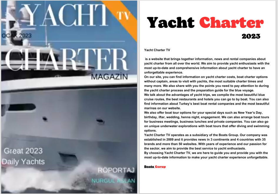 We broadcast your products and services to a wide audience through 19 local Turkish and 51 international English-language web platforms. Whether it’s rental and sale of boats, sailboats, motor yachts, catamarans, inflatable boats, or marine engines, we promote your offerings globally. Additionally, we amplify your news on boat and yacht materials with highly effective SEO-focused content.